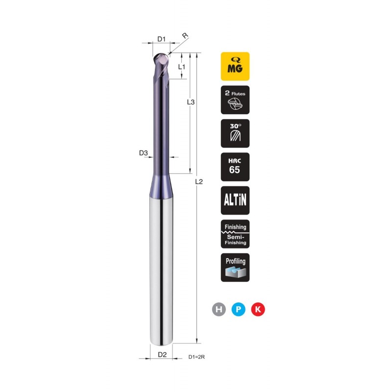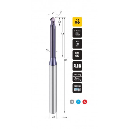 Freza sferica din carbura detalonata - gat lung 6mm - finisare - 2 dinti unghi 30° acoperire ALTiN