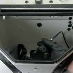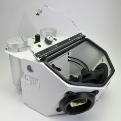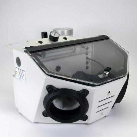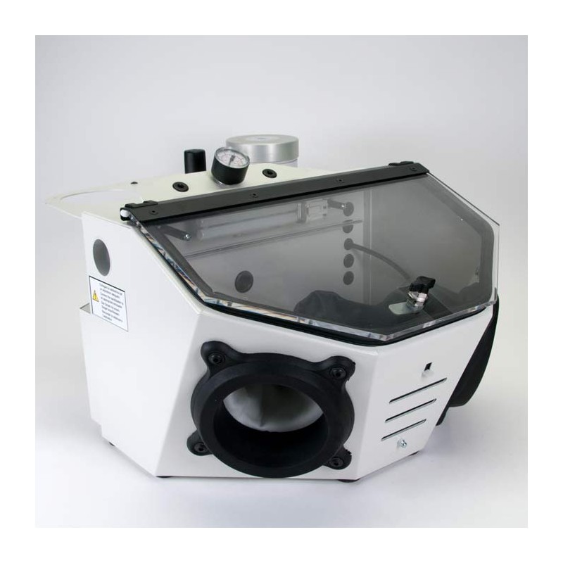 La partea posterioară a aparatului se află un conector, la care se poate conecta un aspirator industrial, ce poate fi pornit şi oprit de la aparatul de sablare. Fereastra mare de vizualizare și iluminarea uniformă a cabinei oferă o imagine clară.