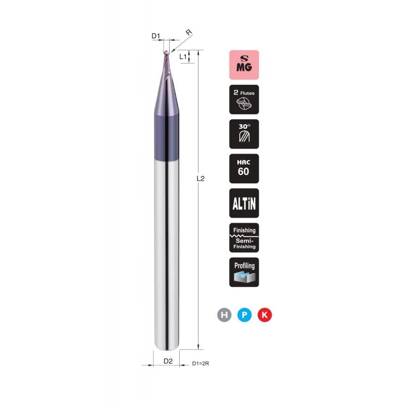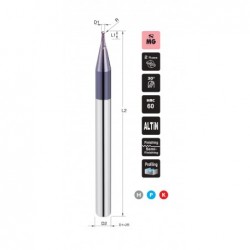 Microfreza sferica din carbura din carbura - finisare - 2 dinti unghi 30° acoperire ALTiN