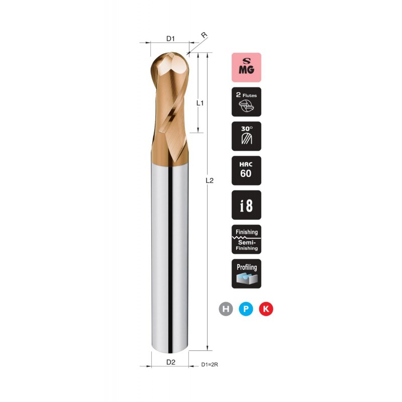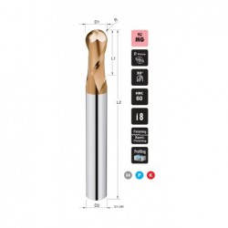 Freza sferica din carbura cu 2 dinti - coada lunga - finisare - unghi 30° acoperire i8