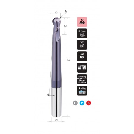 Freza sferica din carbura cu 2 dinti - gat conic - finisare - unghi 30° acoperire ALTiN